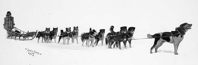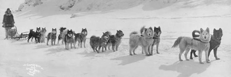 Kuvassa Ramsayn Tšukotkalta 1909 tuottamia koiria. Kuvan valjakko tuli toiseksi vuoden 1910
