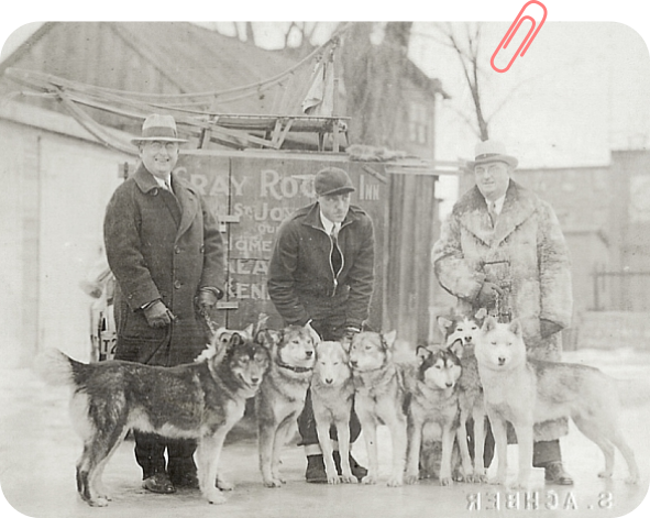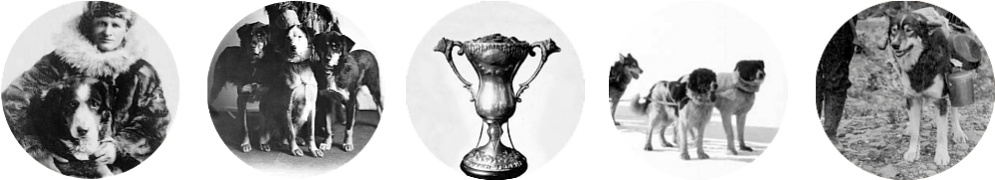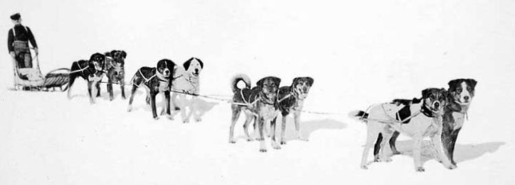 Yllä olevassa kuvassa on vuoden 1908 voittajavaljakko. Takana näkyy isoja, arktisia malamuuttityyppisiä koiria ja kärjessä