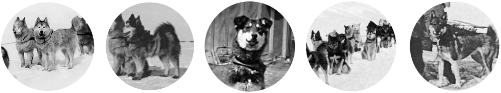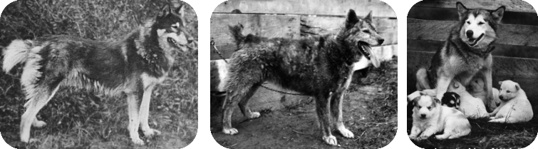 Ensimmäisessä kuvassa Scotty Allan ja johtajakoira Baldy Of Nome (William W. and Neeta Tobey Sale Photograph Collection, 1905-1912. ASL-PCA-384). Toisessa kuvassa Allanin valjakon koiria, huomaa koko ja vahva luusto (Dr. Daniel S. Neuman. Photographs, 1911-1920. ASL-PCA-307). Palkinto on All Alaska Sweepstakesista 1909 (Nome dog mushing photographs, UAF-1984-192-69). Valjakkokuvassa 1900-luvun alun rekikoiria, viimeisessä kuvassa rekikoira kesäkäytössä, Seward Alaska (public domain).