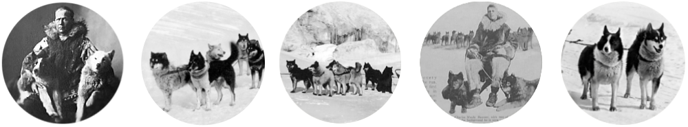 Kuvissa Johnsonin ja Ramsayn tuottamia koiria. Henkilöt kuvissa: ensimmäisenä John Johnson ja vuoden 1910 johtajakoirat Kolma (Kolyma) ja