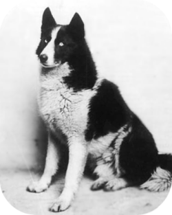 lisäksi pidempikarvainen ja töpöhäntäinen johtajakoira Russky (Petropavlovskista, Kamtshatkalla koirien hännät usein typistettiin), sekä sinisilmäinen