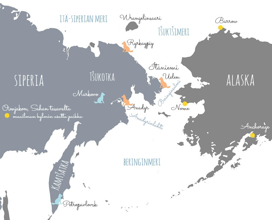 Suuripiirteinen kartta kuvaa koiriemme historian kannalta tärkeitä paikkoja. Koira-symbolit kuvaavat alueita, mistä siperialaisia koiria tuotettiin Alaskaan. Oranssit symbolit kertovat siitä, että koirat olivat mitä suurimmalla todennäköisyydellä tšuktšikoiria. Sinisellä symbolilla merkityissä paikoissa oli myös muiden kansojen koiria. Petropavlovskista tuotuja koiria ei koskaan käytetty jalostukseen.