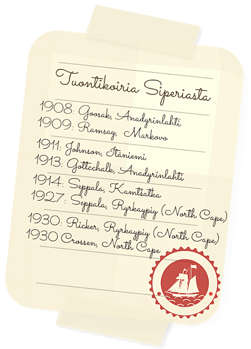 ja pohtinut tietävänsä mistä löytyy vielä parempia rekikoiria. Hän tuotti koirat Tšukotkalta Anadyr-lahden alueelta, eli ensimmäiset