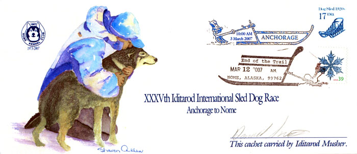 Kuva yllä: Iditarod-kilpailussa ajajat kuljettavat mukanaan postia Anchoragesta Nomeen. Vuosittain ajajille jaetaan erilaiset "kortit", jotka leimataan kilpailun alku- ja loppupaikoissa. Ne ovat keräilyaarteita ja kalleimmat ovat reilusti yli 500 dollarin arvoisia. Kuvassa vuoden 2007 kortti, jonka Don Smidtin siperianhuskyvaljakko kuljetti mukanaan. Ensikertalainen, eli rookie-ajaja saapui maaliin kaikki 16 koiraa valjakossa (Kuuhaukun kennel, Jaana Sudensaagan kokoelma).