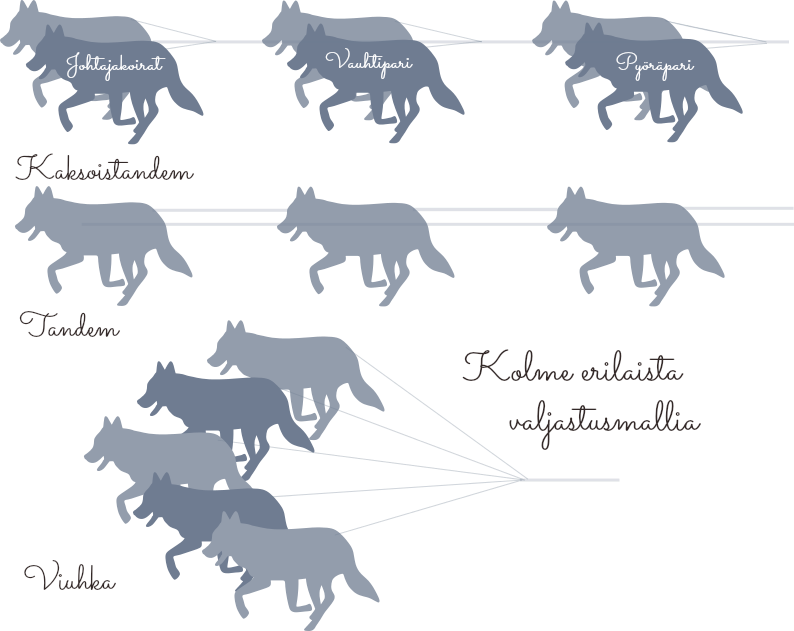 Koirat valitaan valjakkoon tietyille paikoille ominaisuuksiensa mukaan. Johtajakoira juoksee valjakon kärjessä joko yksin tai parijohtajan kanssa (parijohto taitaa olla nykyään yleisin). Johtajakoiran on oltava nopea ja innokas vetäjä ja sen on pidettävä liina aina kireällä. Se ei saa reagoida ulkopuolisiin ärsykkeisiin ja sen on ohitettava vaivattomasti niin vieraat koirat, toiset valjakot kuin saaliseläimetkin (poroja kohtaa usein Lapissa). Johtajakoiran tulisi totella komentoja, mutta kyettävä myös itsenäiseen ongelmanratkaisuun ja nopeisiin päätöksiin. Se on siis vastuullisen koiran työ. Eritasoiset johtajat ovat avoimen kentän johtajia, gee/haw-johtajia ja urajohtajia. Johtajan takana tulee vauhtipari eli swing dogs, jotka ovat myös valjakon nopeimpia ja innokkaimpia menijöitä. Takimmaisena ja lähimpänä rekeä on pyöräpari, eli wheel dogs. Ne eivät ole kaikkein nopeampia, mutta vahvoja, sillä reen liikkeet kohdistuvat voimakkaimmin niihin. Vauhti- ja pyöräparin välillä ovat tiimi- tai valjakkokoirat, eli team dogs. Niiden tärkein tehtävä on pitää liinat kireällä ja seurata innokkaasti etummaisia koiria.